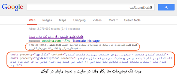 خیر، گوگل تعداد زیادی از تگ های متا را میشناسد، بعنوان مثال تگ توضیحات متا بعنوان محتوایی که در نتایج گوگل نشان داده میشود استفاده میشود. تصویر زیر نمایی از این مثال را نشان میدهد: